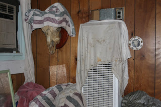 and an inexperienced roofer-helper, we had a disastrous and very personal encounter with Mother Nature--INSIDE. Rain poured through the inadequately tarped roof-- a roof of nothing but boards. Rain poured into the house. Soaking ceilings, walls, floors, artwork, clothing, dogs (we got them out right away) and us. By mid-day the living room ceiling was pulled down for safety. We had to get out. Luckily we have insurance and they found us a place to put our heads while we have work done on the house. And I bailed Cooper out of Camp Chez Doc Coyne and he stays at the motel with us, unless we both are at the house working, which we will be today, and then he goes back to the kennel for the day.
